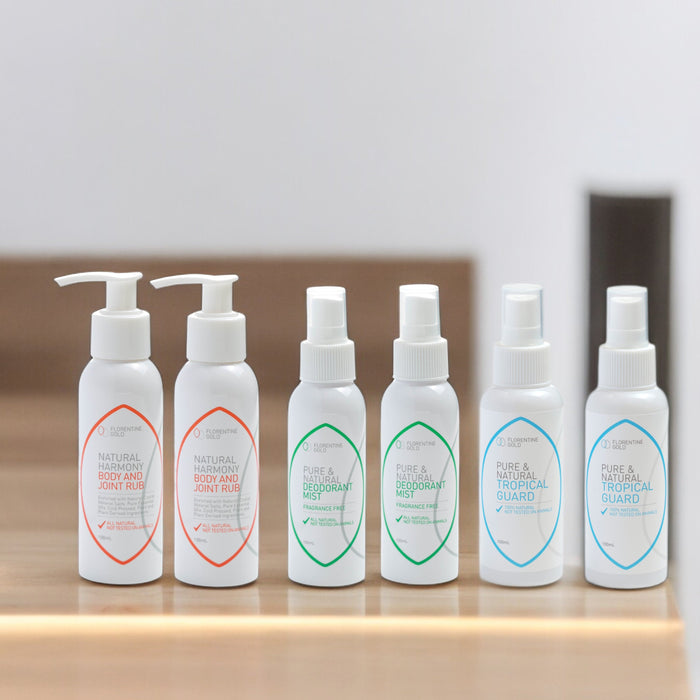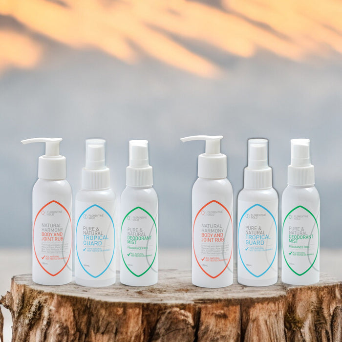 Florentine Gold's Travel Pack, featuring three essential products designed to enhance your journey. This pack includes our Tropical Guard, Fragrance-Free Deodorant Mist, and Natural Harmony, each in convenient 100ml sizes. Natural Harmony Body &...
