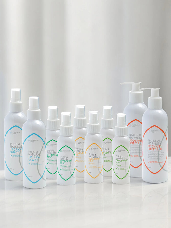 Introducing Florentine Gold's Family Pack, designed to keep your family refreshed, protected, and confident. This pack includes 2 x Natural Harmony 200mL, 2 x Tropical Guard 200mL, and 2 x Fragrance-Free Deodorant. Products, offering a comprehensive solution for your family's outdoor adventures....